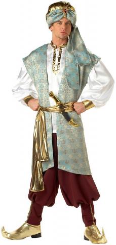 The elite Sultan costume includes a brocade vest, shirt with gold trimmmed placket and cuffs, sash, pants with buttoned cuffs, turban with large jewel and gold vinyl shoe covers