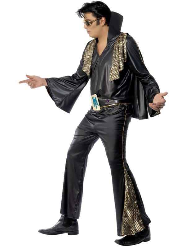 This deluxe Elvis costume includes a shiny black v-neck top with an over sized foam collar with a gold sequins along the trim and flared sleeves with gold sequins and detailing. A pair of black flared trousers with sequins along the side of leg and gold detailing at the bottom are also included.