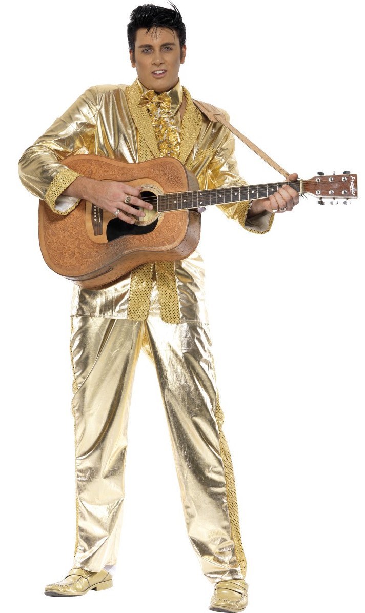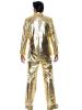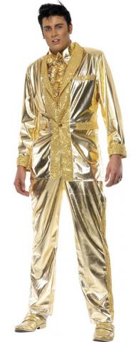 Elvis gold costumes consists of a metallic gold jacket with sequins and matching metallic gold trousers