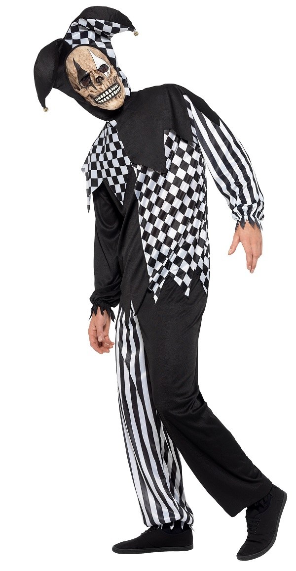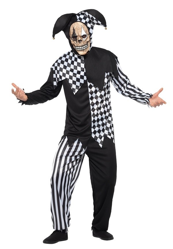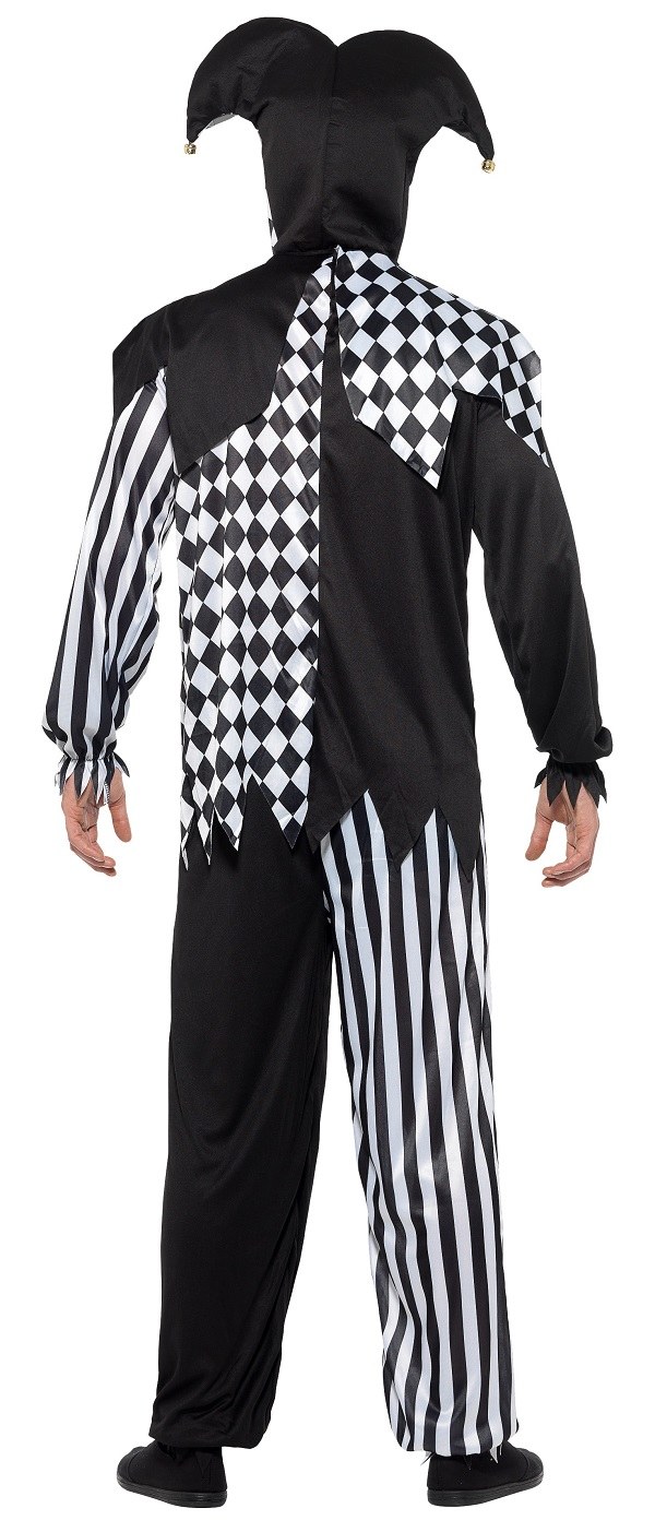 Evil Court Jester Costume includes a black and white top with collar and a pair of matching trousers. Costume also includes a jester headpiece.
