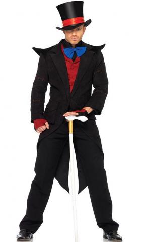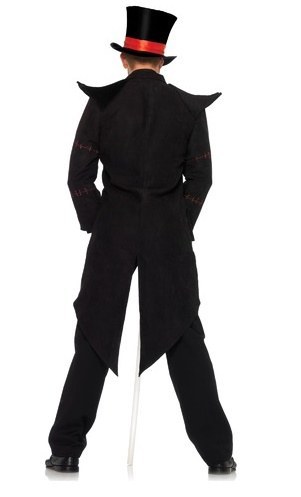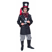 Evil Mad Hatter costume includes a long black jacket and wine velour waistcoat. Also included is a blue bow tie and a pair of wine gloves.