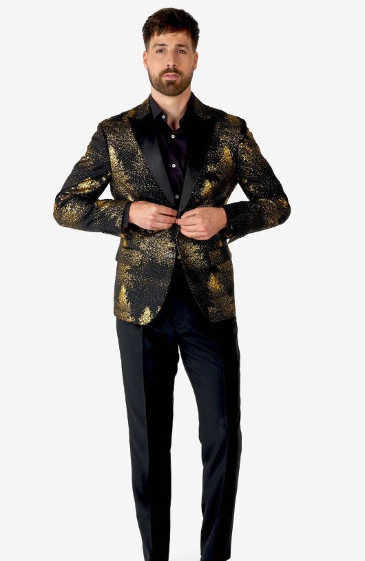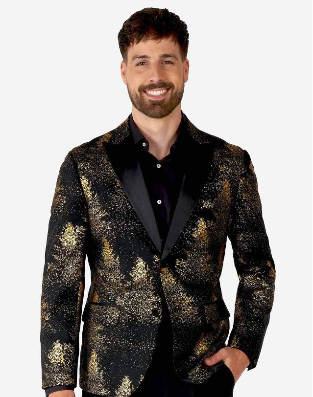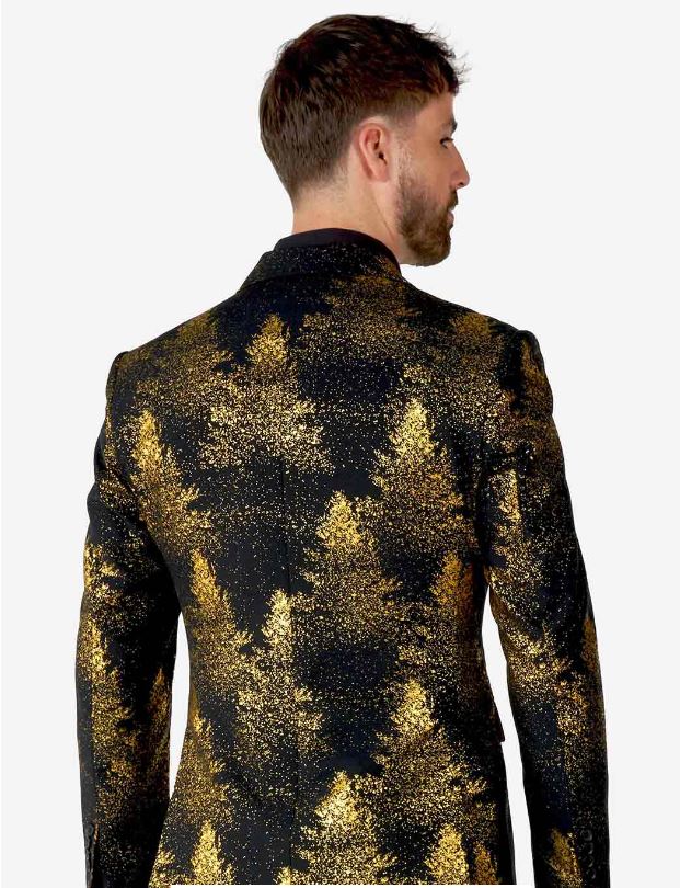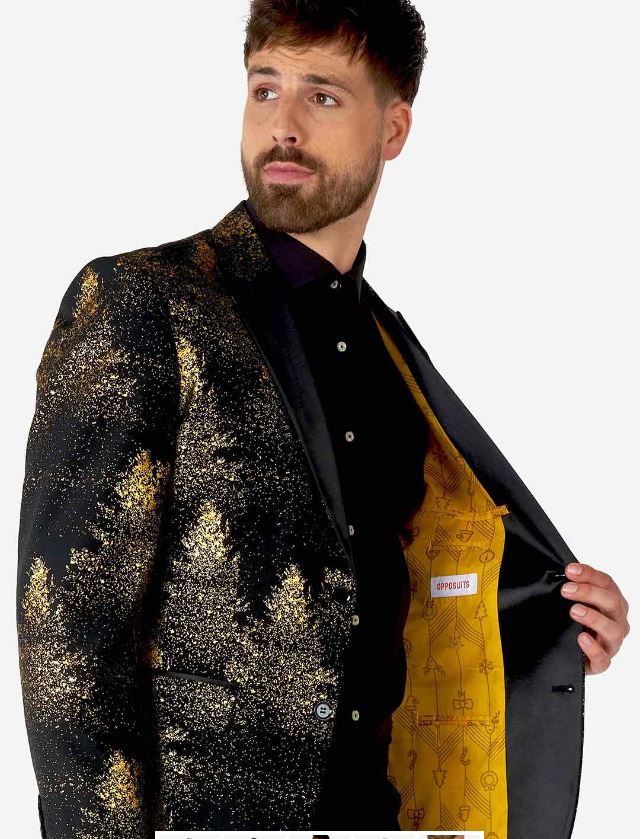Delight you and everyone around you wearing our Festive Forest OppoSuits Deluxe Blazer. This Christmas blazer is covered in gold foil pine trees that will make you the most festive guy in the room. Have yourself a merry little Christmas with the Festive Forest blazer!