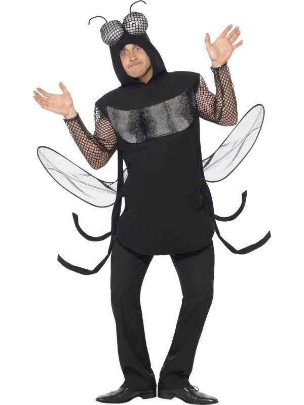Stand out at your next fancy dress party with our Fly costume, This hilarious costume consists of a black tabard with fishnet sleeves and an attached hood with antennae and eyes. The tabard also features wings and fly legs.