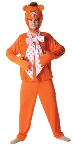The Officially Licensed Muppets Adult Fozzy Bear Costume includes overhead furry headpiece with attached brown hat, furry top with attached oversized white and pink necktie and hands,