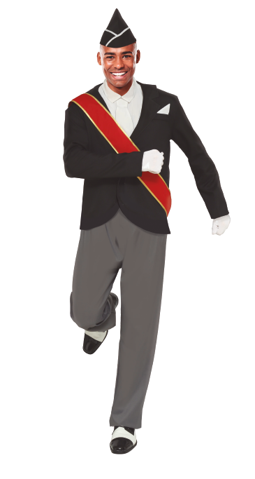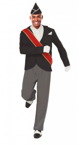 This costume includes a hat, sash, jacket with attached shirt and trousers.