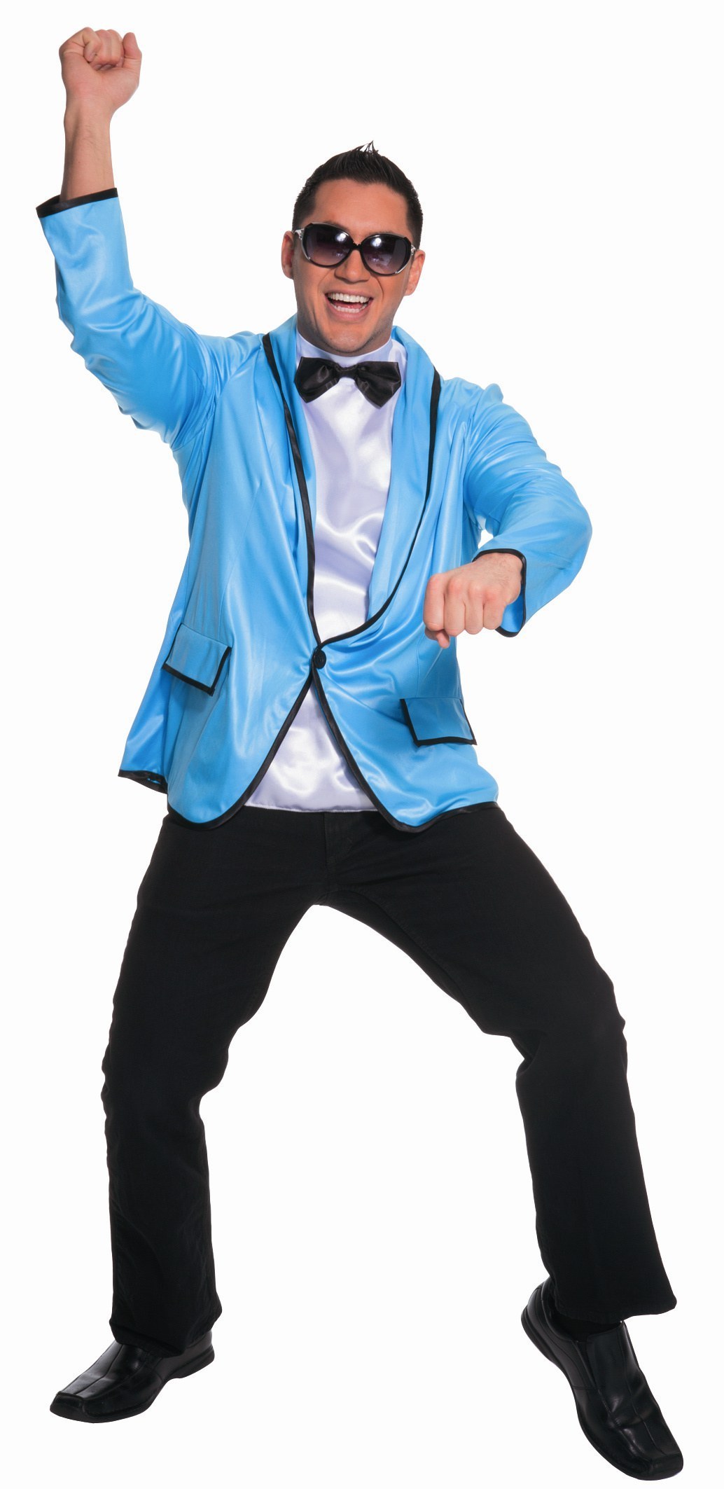 Blue satin look Gangnam style jacket and black bowtie. To complete the look a pair of black glasses are also included.