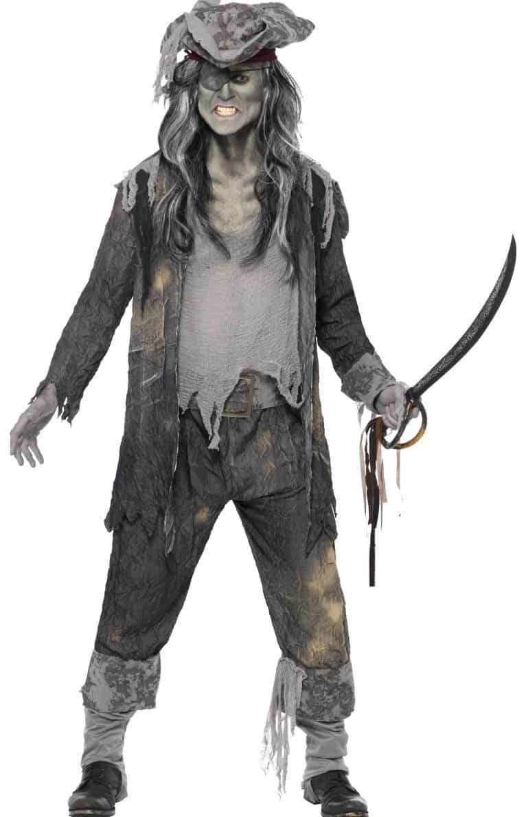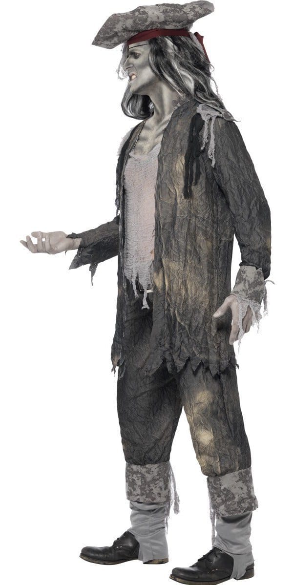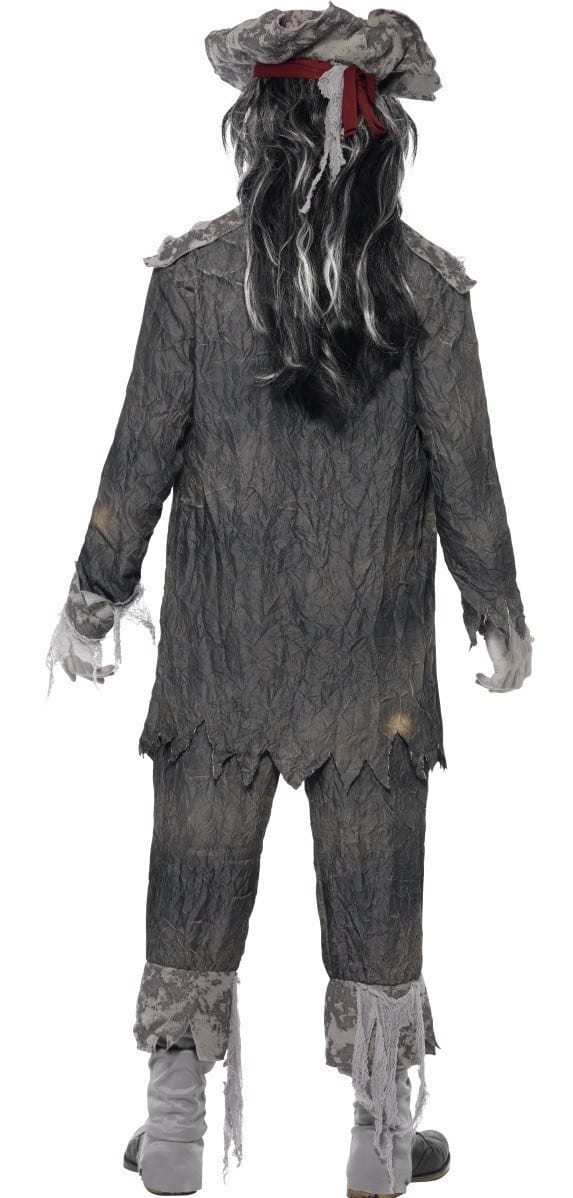 Ghost Ship Ghoul Costume includes dark gray coat with tattered edges gauze fringe and attached faux gauze shirt. The costume is topped off with tattered edged trousers and worn tatterd sailor hat.