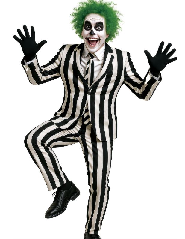 Step into the spirit world with this eerie yet eye-catching Ghost Skeleton Suit for Adults – the perfect blend of spooky and sophisticated! Whether you're haunting a Halloween party, attending a themed event, or just want to stand out on fright night, this costume is sure to turn heads (and maybe even scare a few).Based on the iconic character Beetlejuice from the hit 80’s movie Beetlejuice comes our Sleazy Ghost Costume. This costume includes a black and white striped jacket with a tie and a pair of matching trousers.