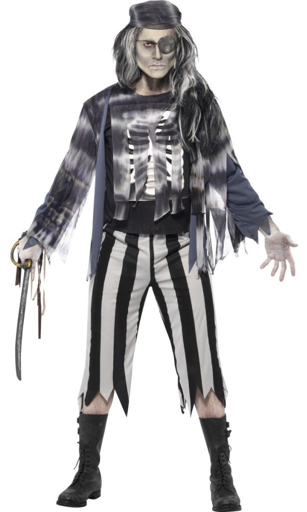 Ghostly Pirate Costume includes a top with EVA chest and attached jacket. Also included in this creepy costume is a pair of black and white striped three quarter length trousers and a grey bandanna.