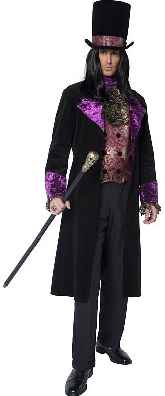 The Gothic Count costume contains three separate pieces. A knee length black velvet effect jacket with purple collar and cuffs, a satin feel waistcoat with black and gold lace frill and button detail and finally, to complete the look a black velvet feel top hat.