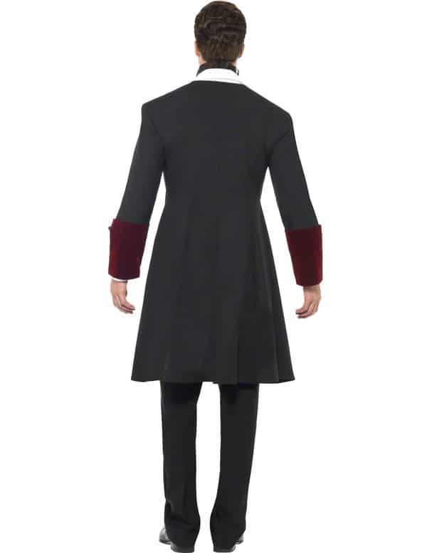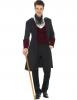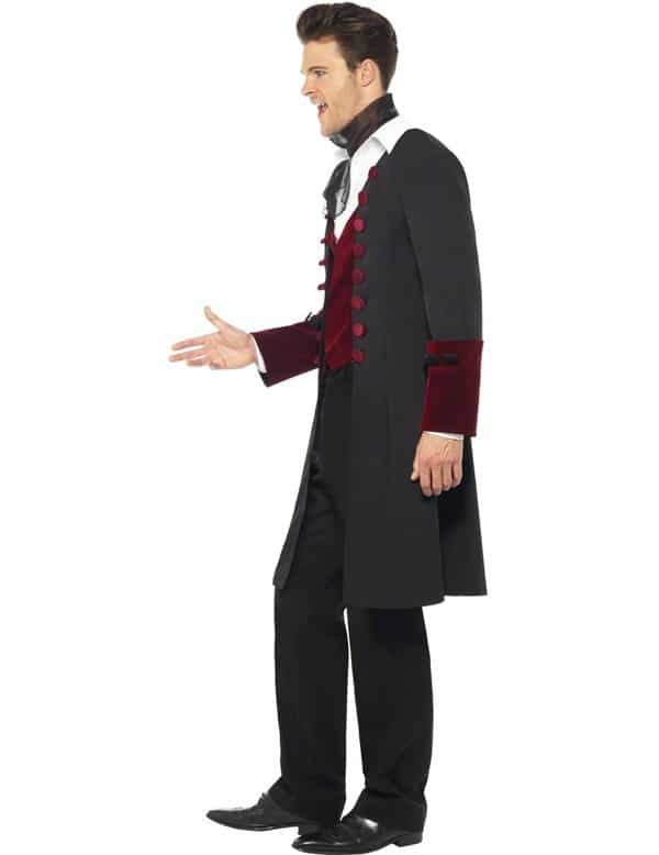 Gothic Vampire costume with a dark red mock waistcoat, a long black and red coat with red buttons and a black semi sheer cravat.