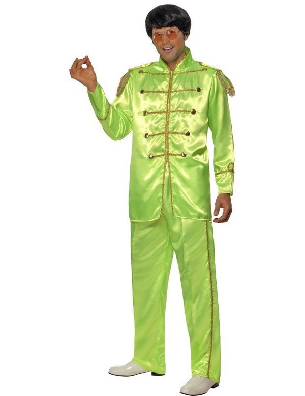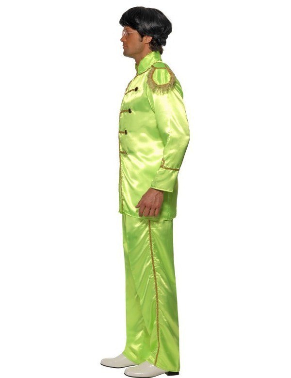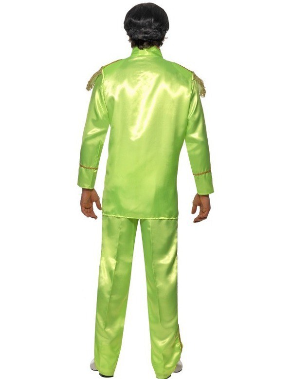 Green Sgt Pepper Costume consists of trousers with elasticated waist and gold brocade down outside leg, jacket with gold brocade, zipped front and gold tasseled epaulets.