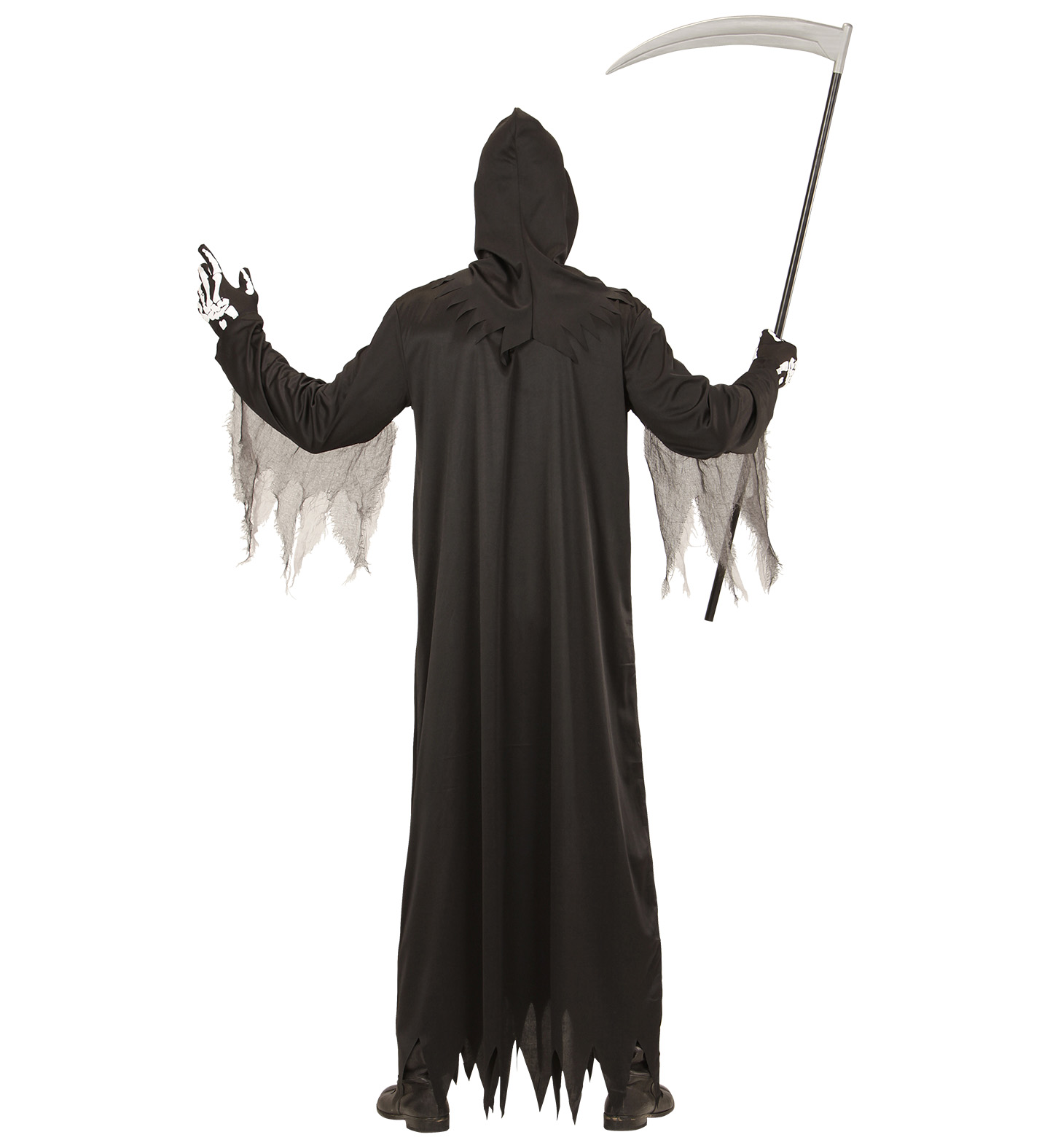 The Grim Reaper Adult Costume includes a long black robe with a mask and a chain.
