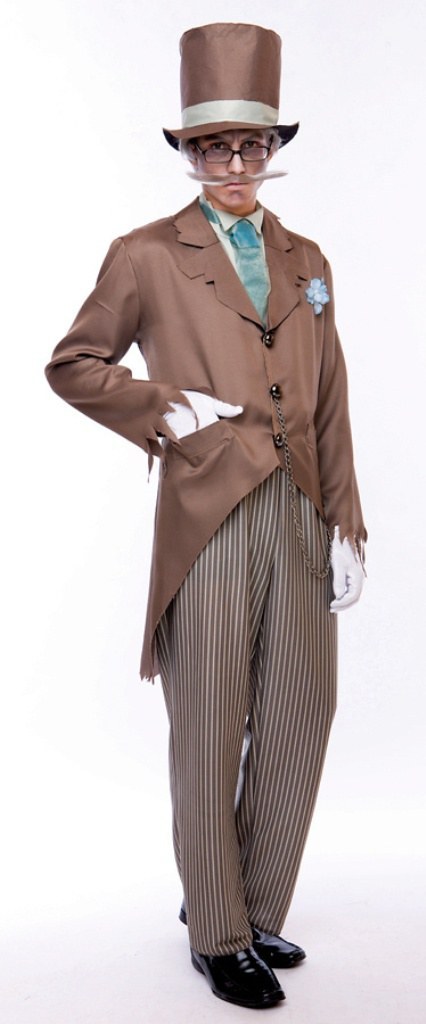 The Haunted Victor Costume features a brown tails coat with attached shirt front and blue cravat and matching blue buttonhole. To complete the look a brown, soft top hat and pin stripe trousers are also included.