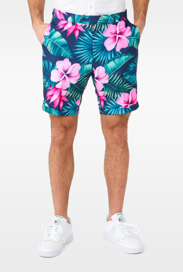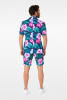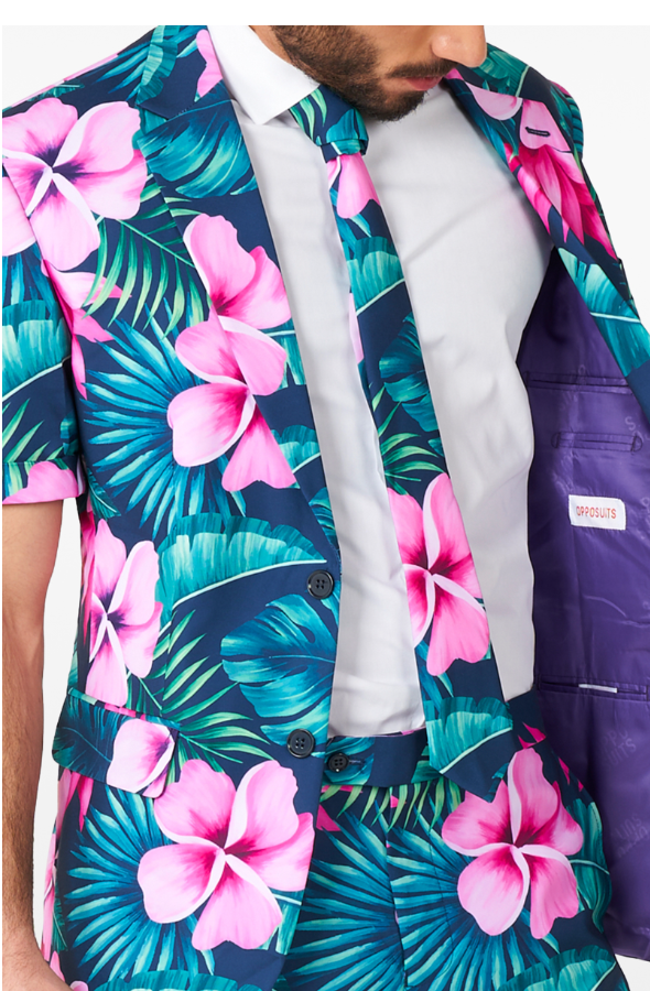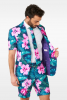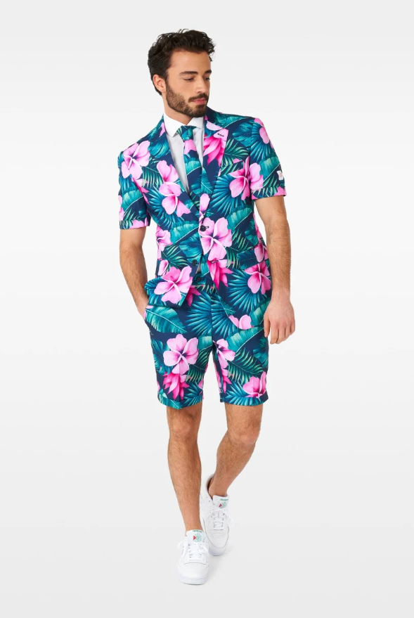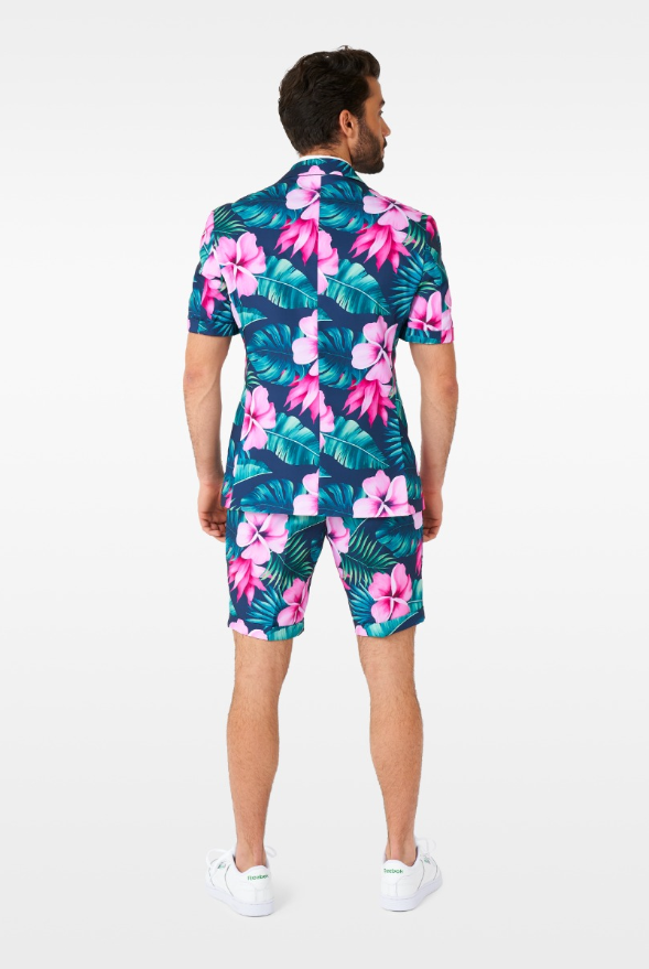 The colourful summer suit includes a Hawaii print jacket, matching shorts and a matching tie.