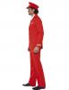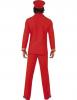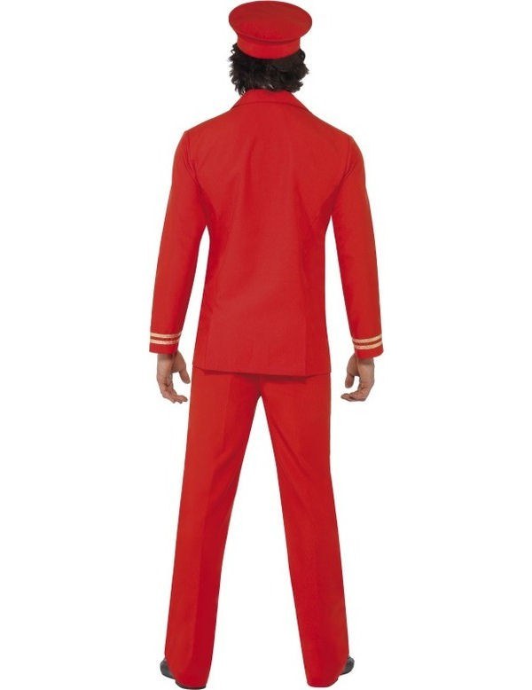The High Flyer Costume includes a pair of red trousers, a matching jacket with gold buttons, gold cuffs and a gold airline logo on the front and a white and red shirt front. To complete the look a matching red cap with a gold airline emblem on the front is also included