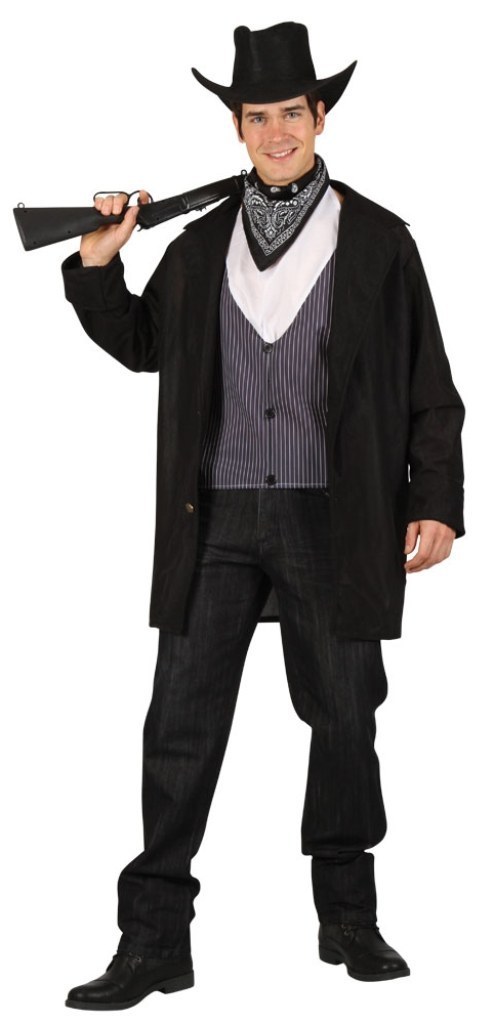 High Noon Cowboy Costume – round up your herd in this fantastic cowboy costume! The costume comes complete with a black duster coat, striped waistcoat with attached white shirt front, black and white bandana and black cowboy hat.