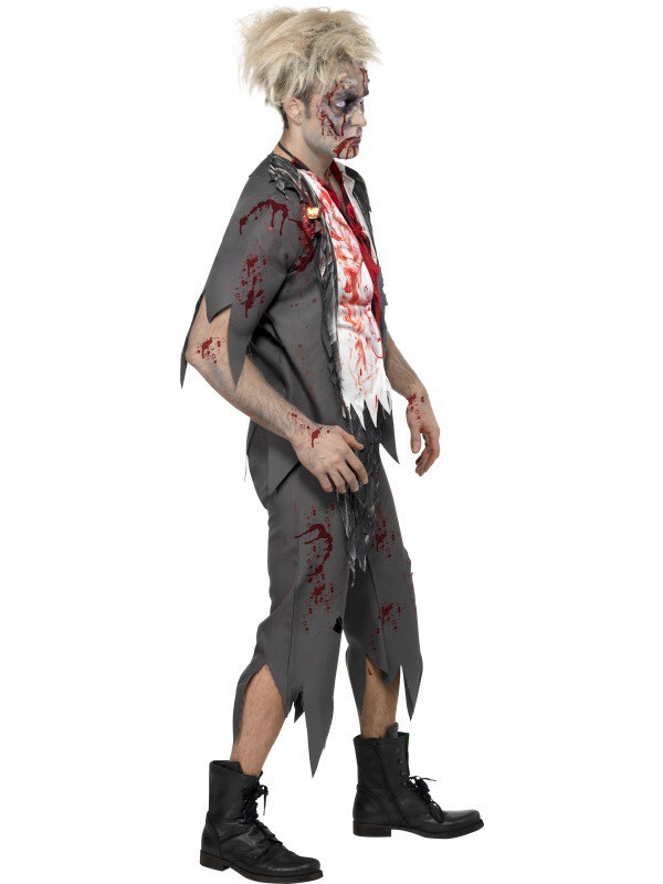 The horrifying High School Horror Zombie School Boy Costume includes a grey frayed jacket with ripped 3/4 length sleeves and an attached white shirt with fake blood stains and jagged ends. To add to the look the costume also comes with a red and black tie and a pair of matching grey trousers with jagged ends.