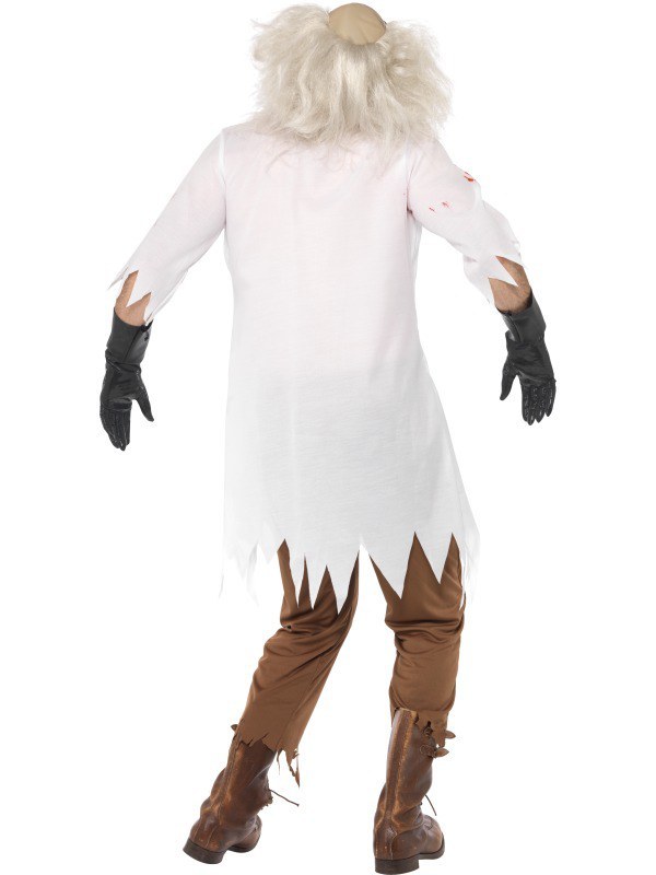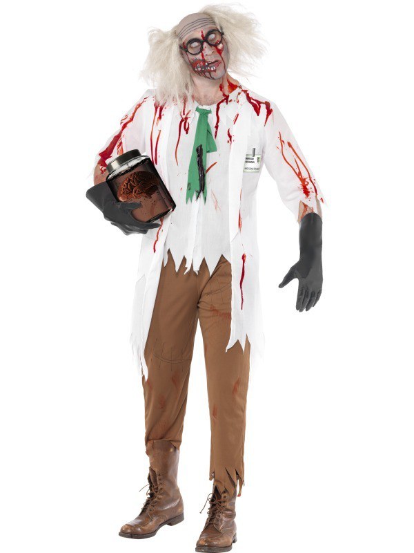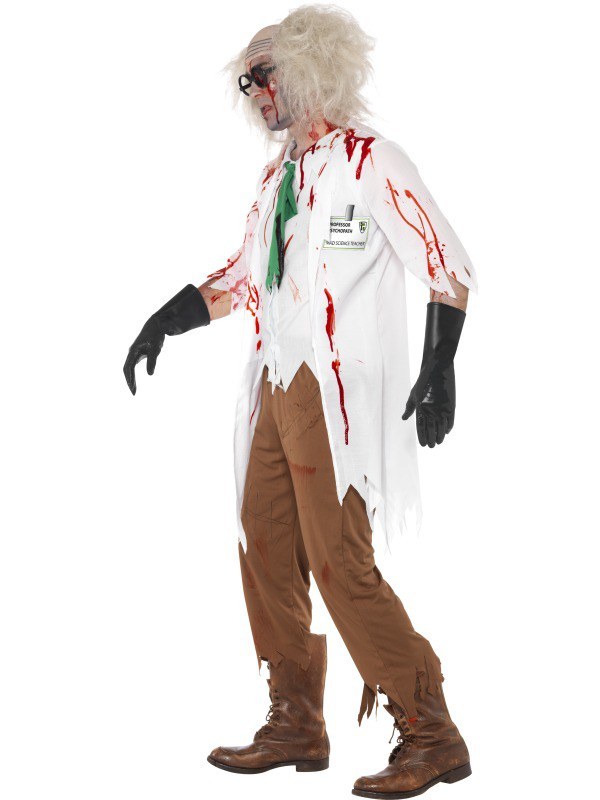 The High School Horror Zombie Science Teacher Costume includes a white lab coat and a green tie both with jagged ends. Also included in the costume is a pair of black gloves and a name badge to complete the scary science teacher look.