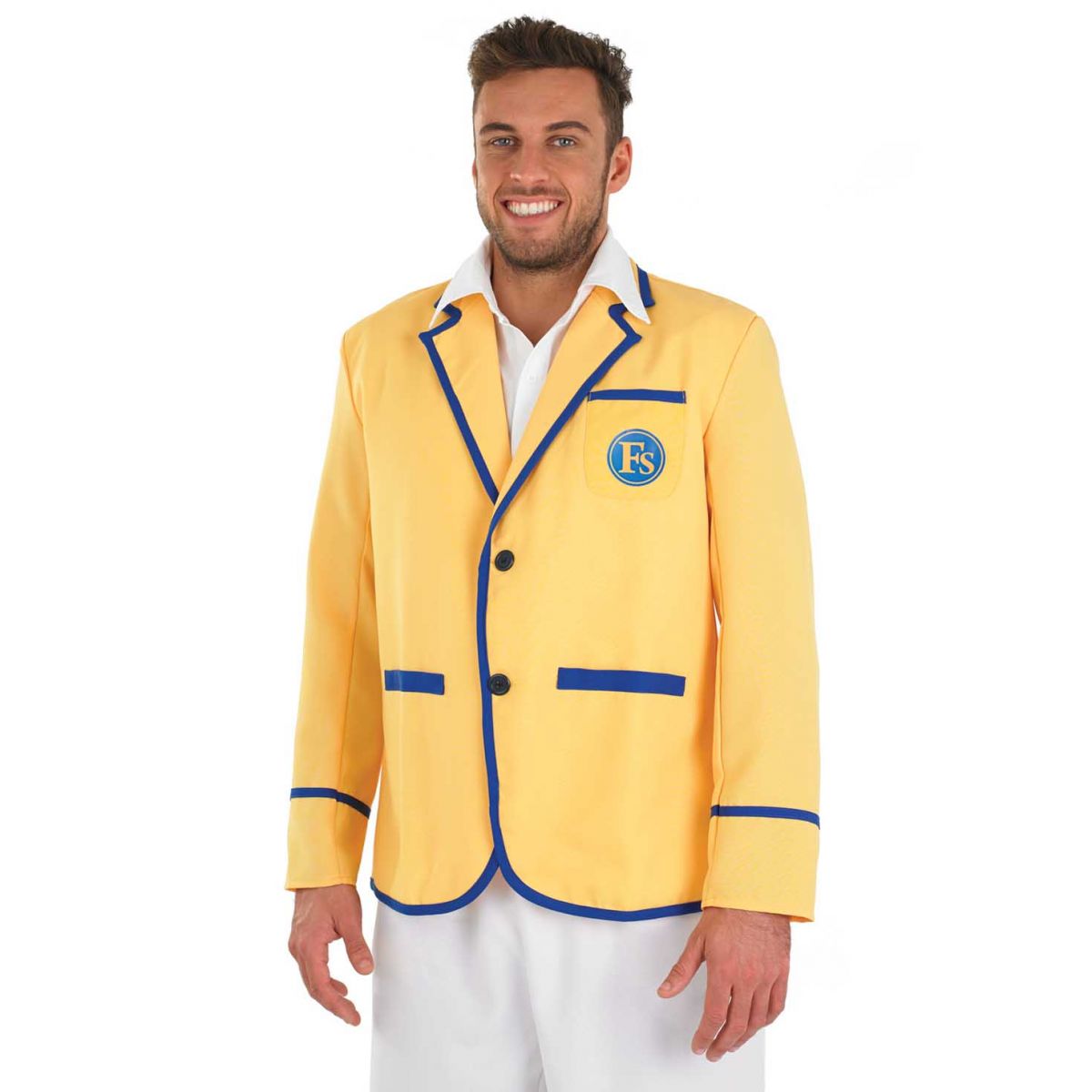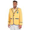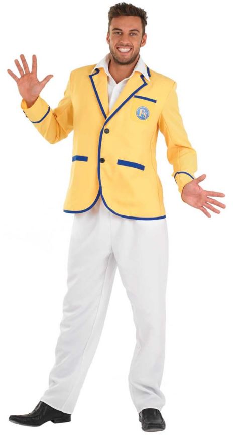 This costume includes a yellow jacket with blue detailing, a white shirt insert and white trousers.