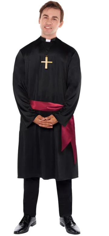 This costume includes a long black robe paired with a white clergy collar a stick on cross
