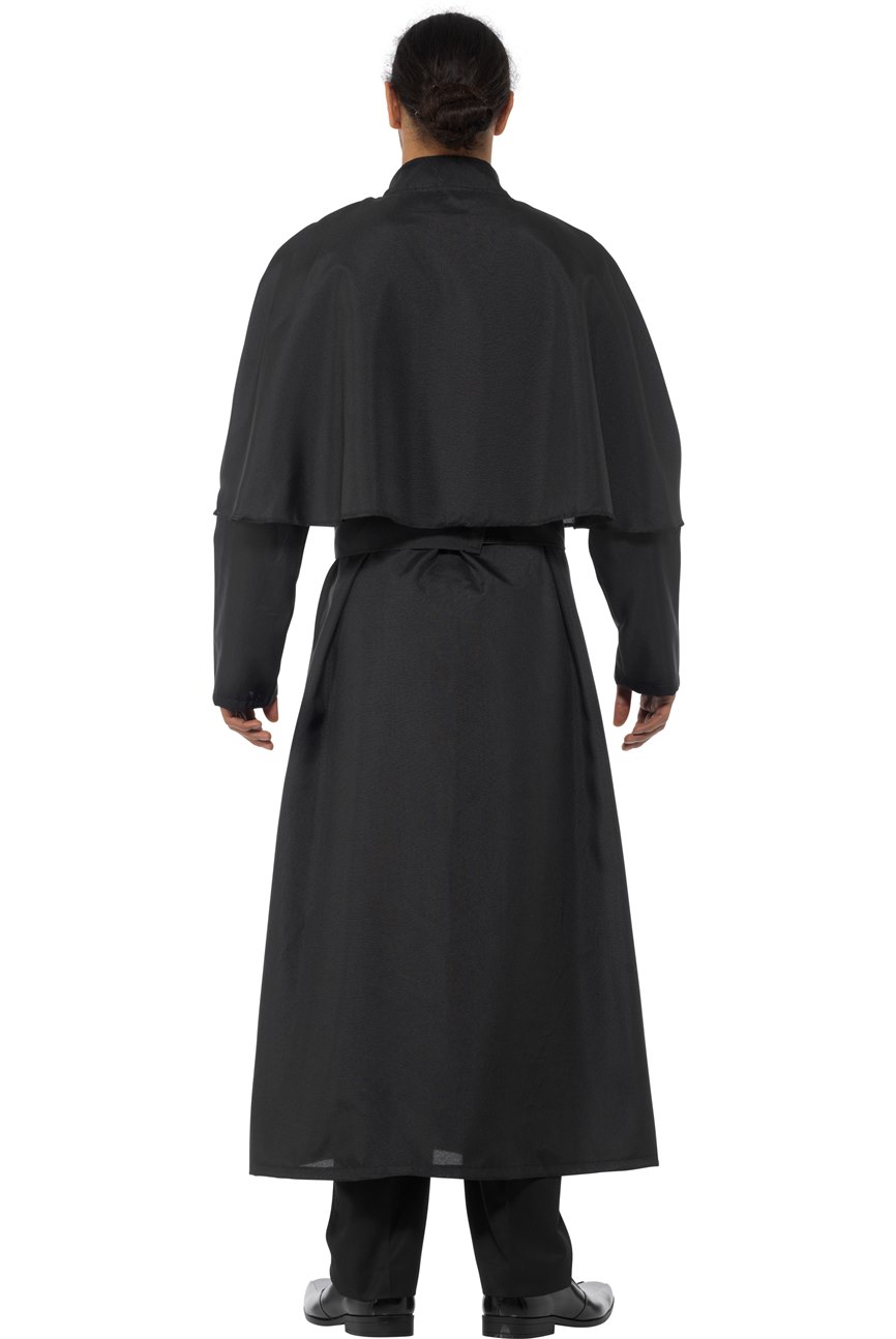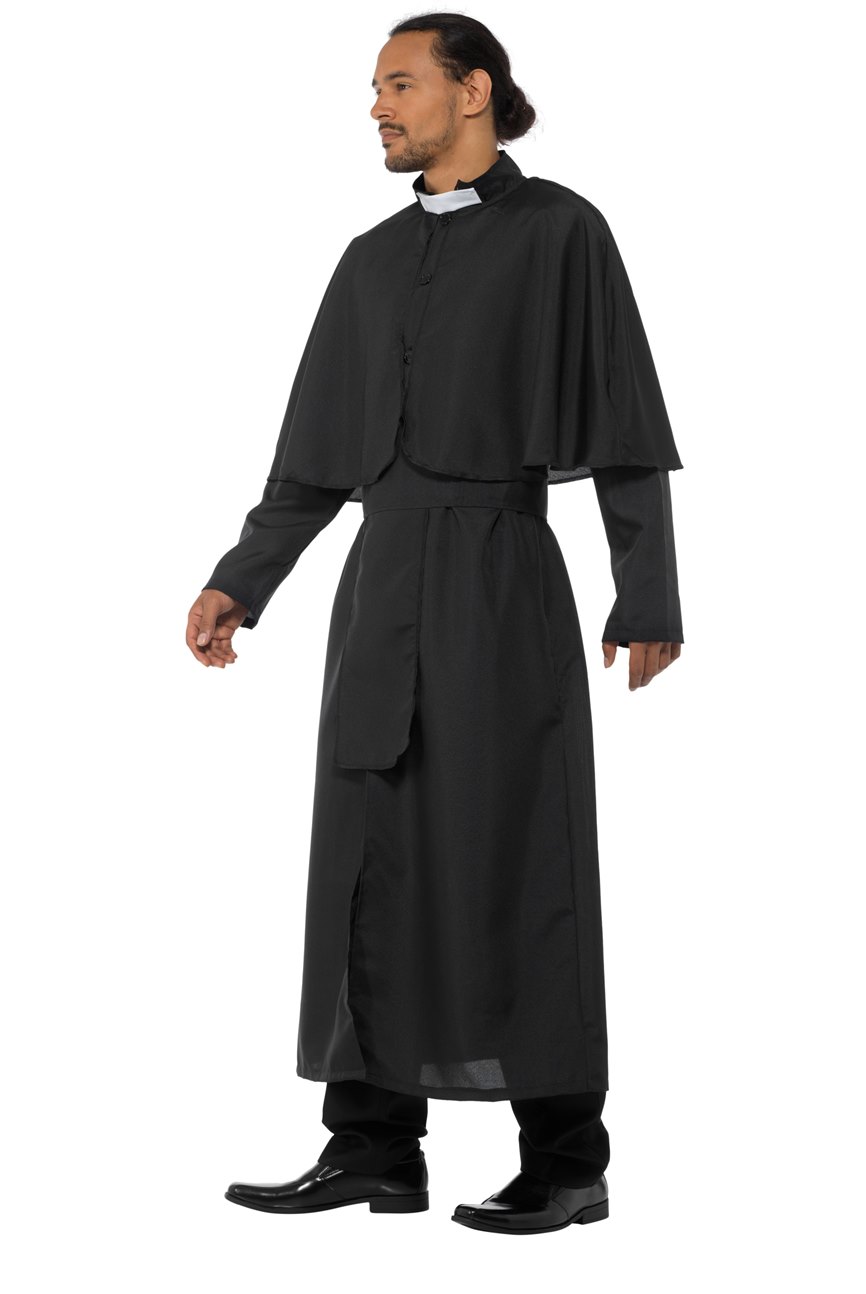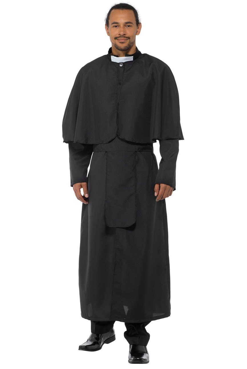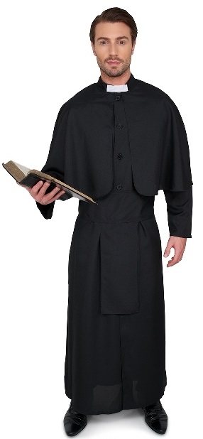 Holy Priest Costume includes a long black robe with with an attached cape and a white collar. To complete the Holy look a sash is also included.