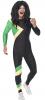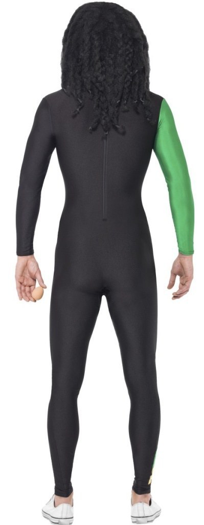 Jamaican Hero Costume includes a black, green and yellow jumpsuit with zipper to the back.