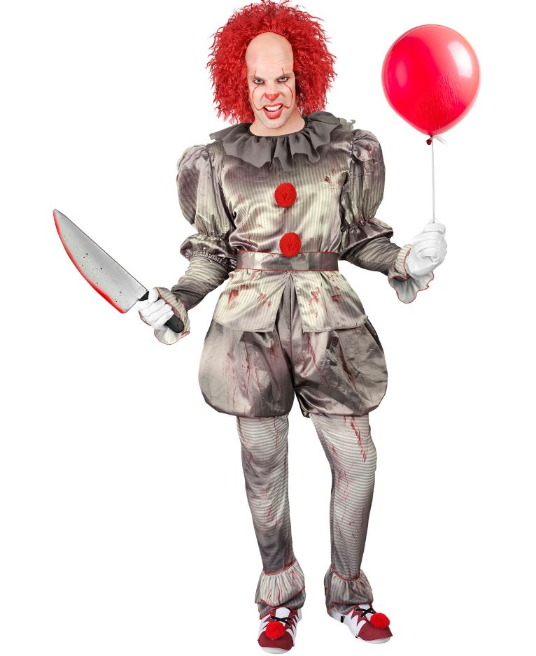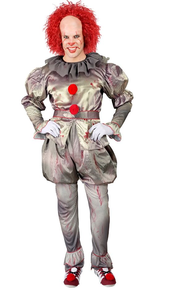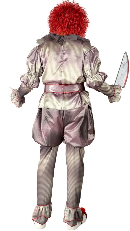 The Killer Clown costume features a creepy and sinister style, including a metallic-looking coat with puffy sleeves, matching pants with distressed detailing, and a pair of puffed shorts. The outfit is completed with a belt, shoe covers, and two red pom-pom accents on the front.