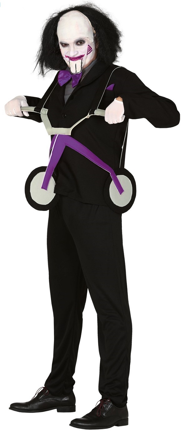 Based on creepy puppet from the hit movie Saw comes our Killer Tricycle Costume. Included in this costume is a black jacket and a black pair of trousers. Costume also includes a jabot with bowtie.