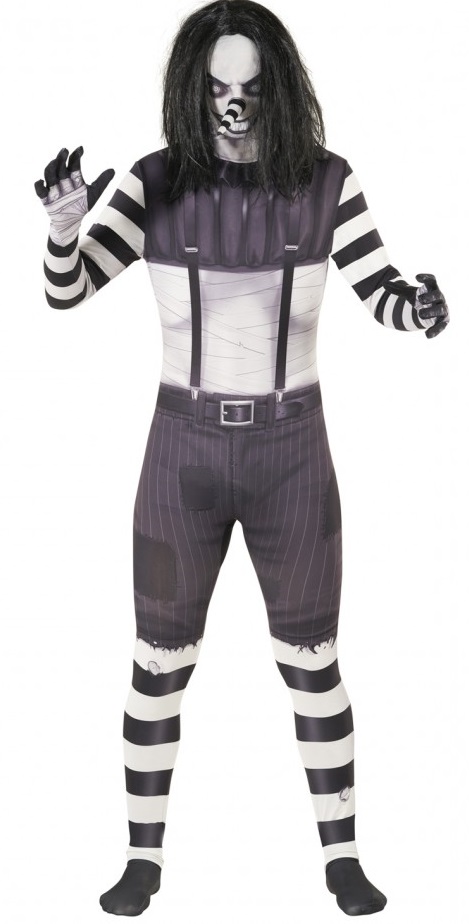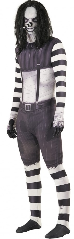 This freaky character is perfect for Halloween as an easy yet terrifying costume. Double stitching all the way around the inside of the suit ensures durability, while two zips make de-morphing quick and easy. A black wig is also included.