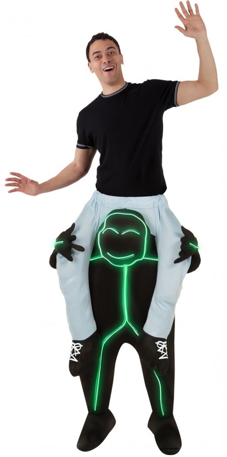 Our Piggyback Light Up Stick Man Costume is the perfect costume or any rave, festival or a night out dancing. This light up costume includes a one piece suit with attached mock arms and legs. The legs are self-stuff legs and are best stuffed with newspaper.
