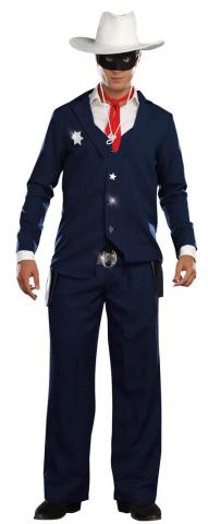 Lone Cowboy costume is a 6 piece set consisting of Jacket, Neck Scarf, Mask, Badge and Holster. To complete the look a white cowboy hat is also included.