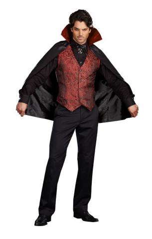 Love At First Bite costume includes a brocade pattern waistcoat. Costume also includes a lined black cape with stand up collar and black bow tie with pentagram detail.