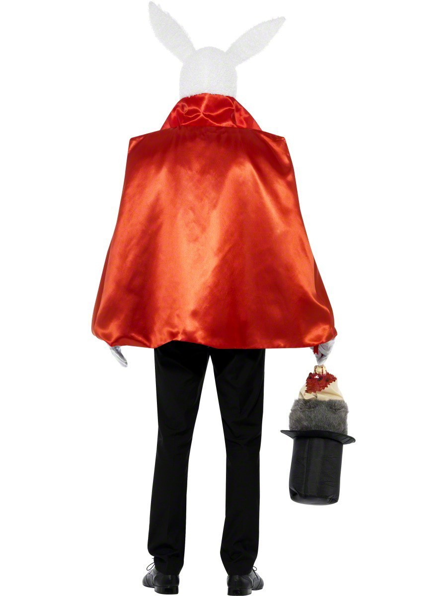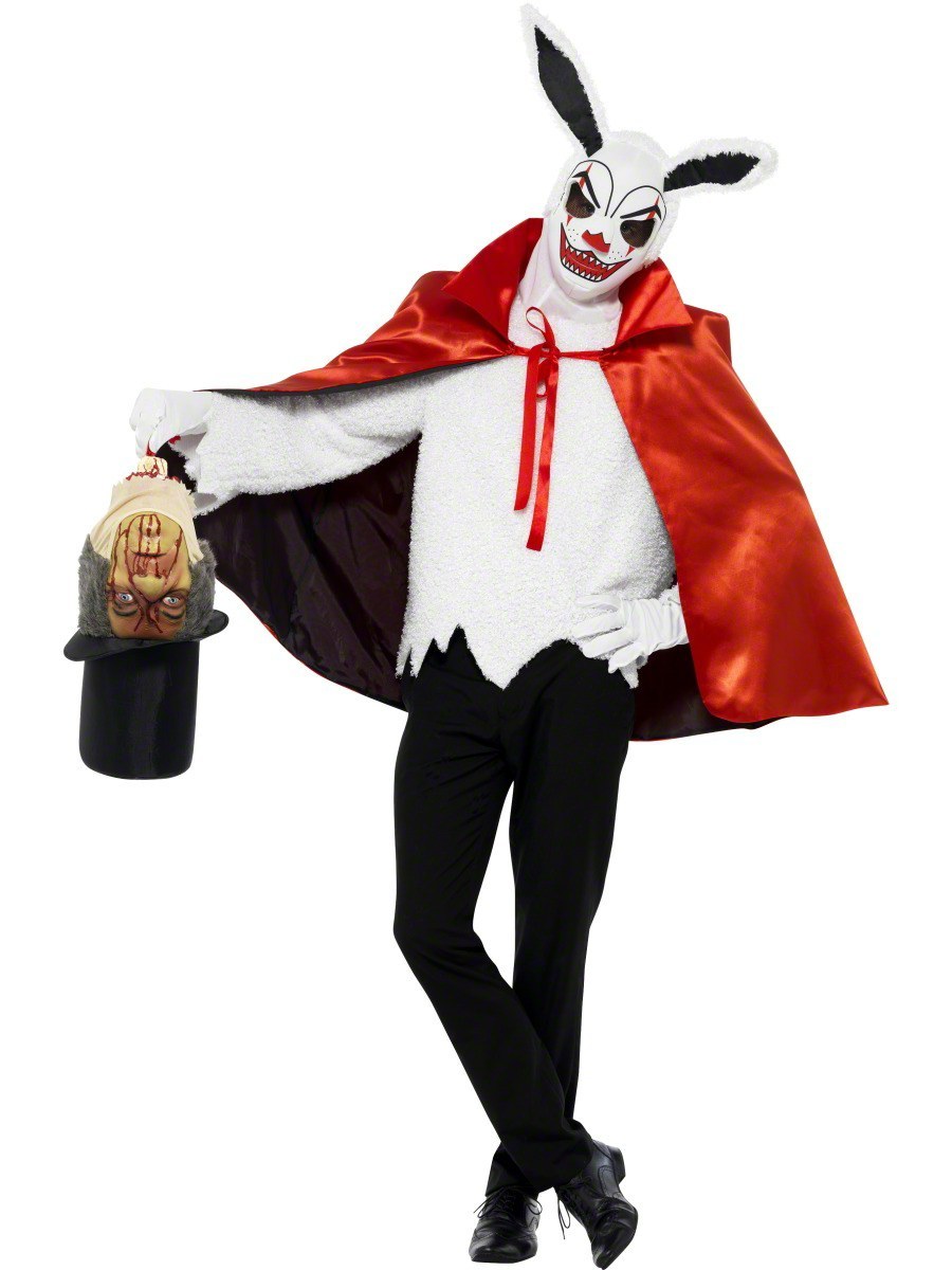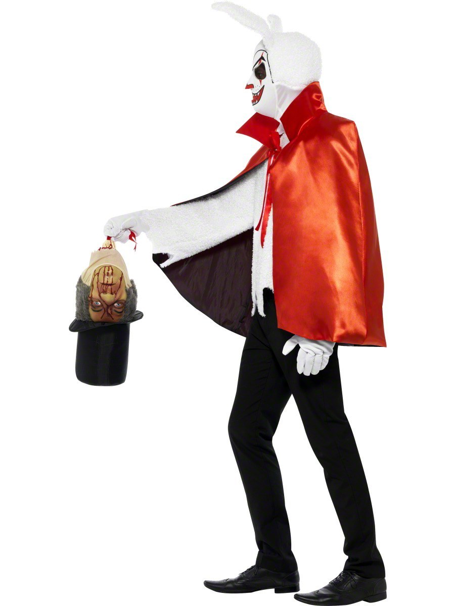 Macabre Magician Costume consists of a faux fur white shirt, red cape with black lining and a pair of white gloves. To complete the gruesome look an overhead scary rabbit mask and top hat with attached severed head is also included.