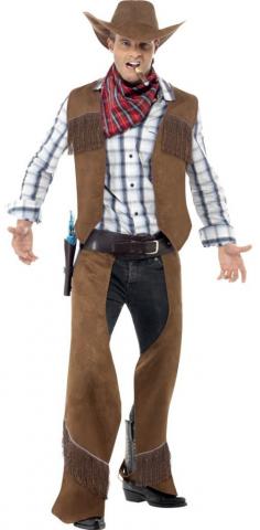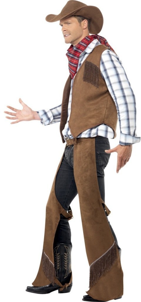 Fringe Cowboy costume includes a brown waistcoat with fringe detailing and a pair of matching chaps. To complete the wild west look a brown cowboy hat and neckerchief are also included.