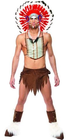Men's Indian Costume is inspired by the Village People costumes. Costume includes a black, white, and red feathered headdress with village people print on the front. There is a chest plate, a brown faux velour loincloth with attached pant underneath and boot covers with white fur to complete the look pictured.