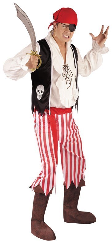 Pirate Man costume includes a pair of red and white striped three quarter length trousers with jagged hemline, black vest with skull print and a red bandana.