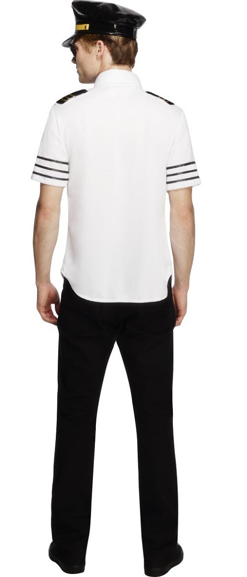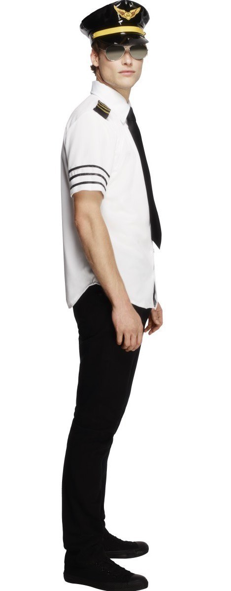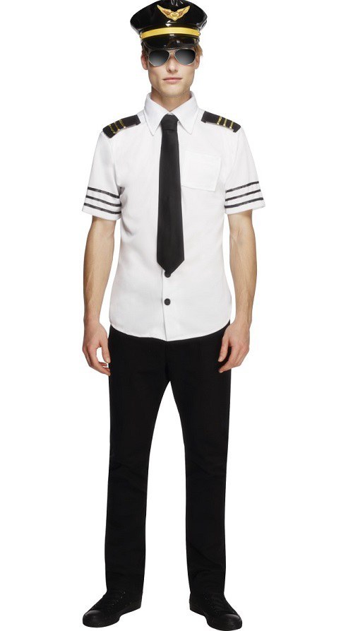 Mile High costume includes a pilot shirt and a black tie. To complete the look a hat is also included. Trousers and shoes are not included. Glasses may be purchased separately.