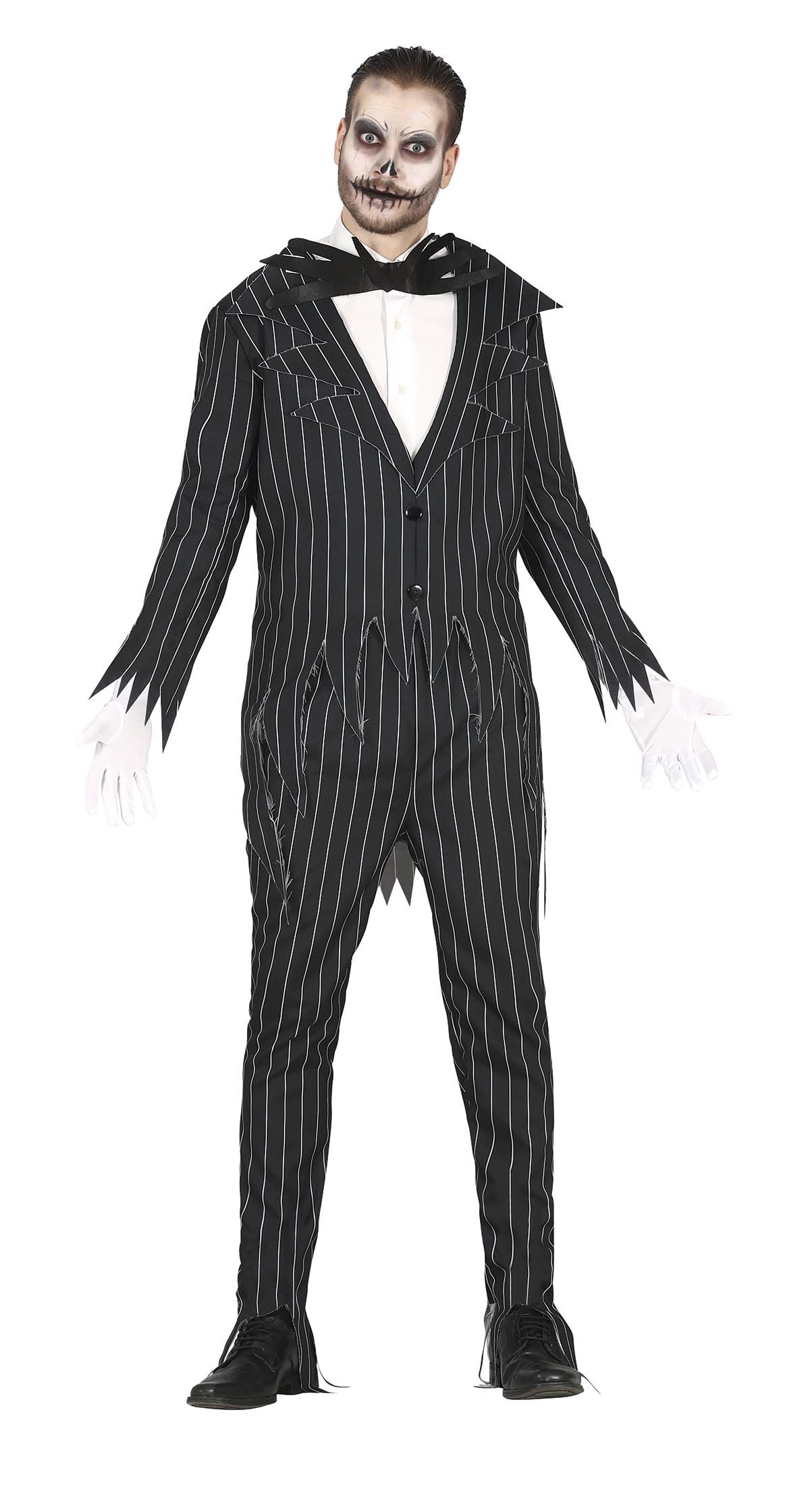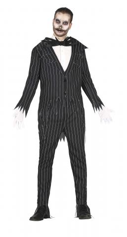 Make sure your Halloween ready with our men's Mr. Skeleton costume. Included is a striped jacket with a shirt and bow tie and matching striped trousers.
