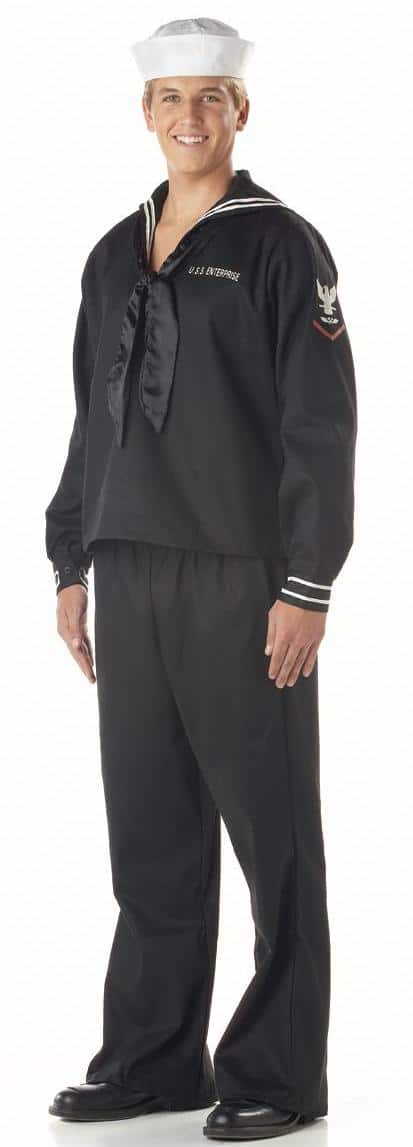 Navy Sailor Costume includes a black Navy top featuring collar and cuffs with contrasting trim, U.S.S. Enterprise printed decal on left breast, printed eagle sailor's decal on left arm and attached burnished black necktie. The top has complete hem finishing.