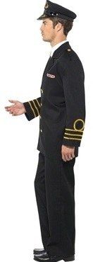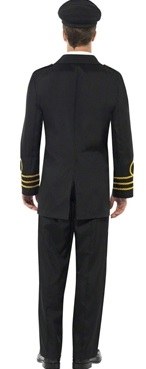 Navy Officer Costume includes a balck jacket with badge and button detailing and a mock shirt front. Costume also includes a pair of trousers.