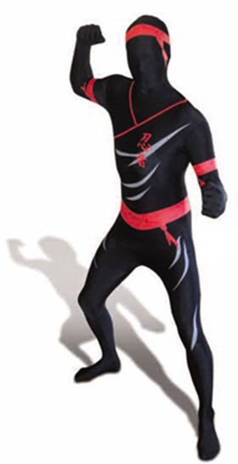 The Ninja Morphsuit is black in colour complete with red headband, belt and arm bands, all printed on the suit.
