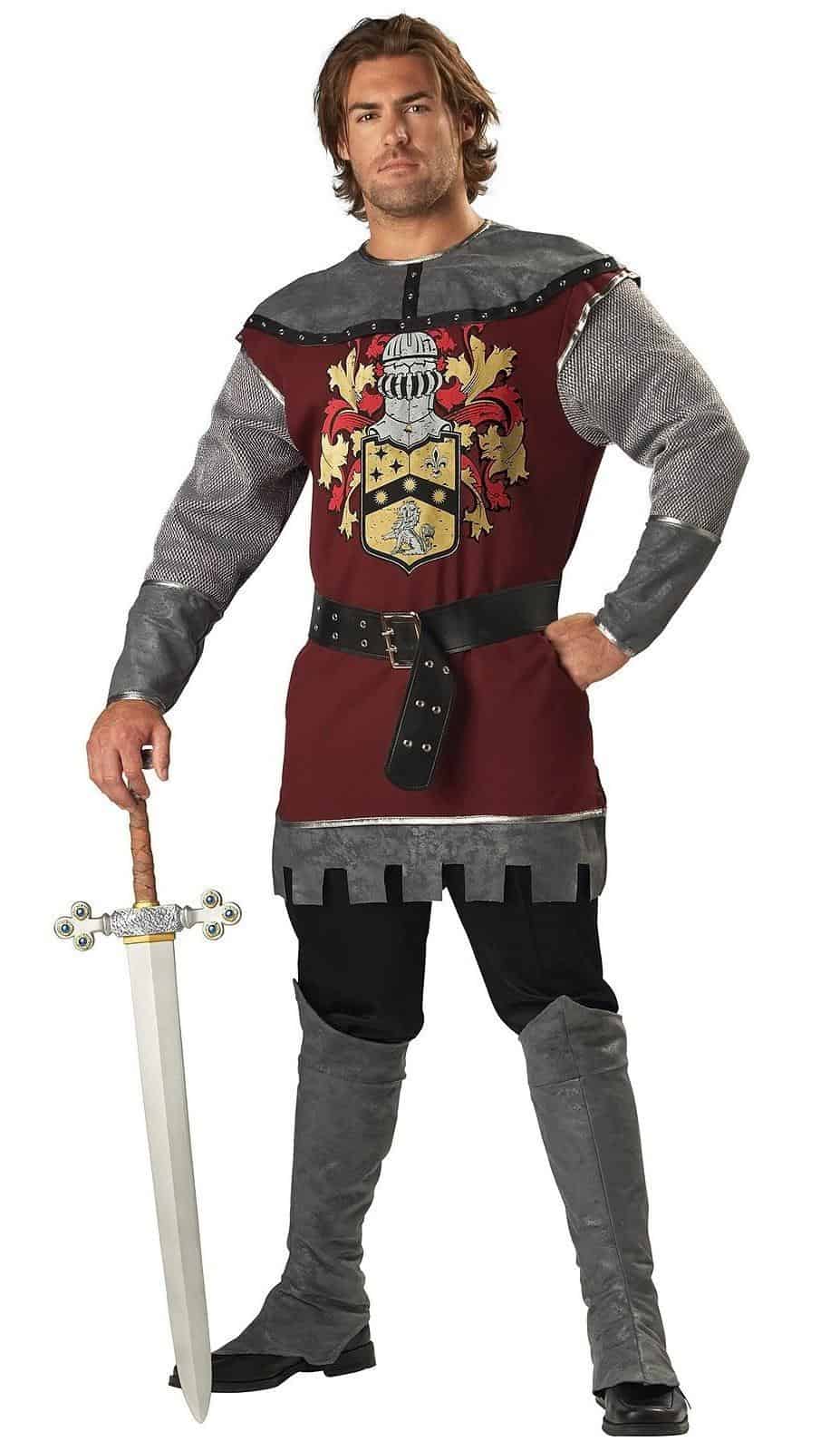 Noble Knight Costume includes a maroon tunic with printed emblem on the front. Top has attached sleeves and collar with a chain mail look, black belt with functioning buckle, and grey boot covers.