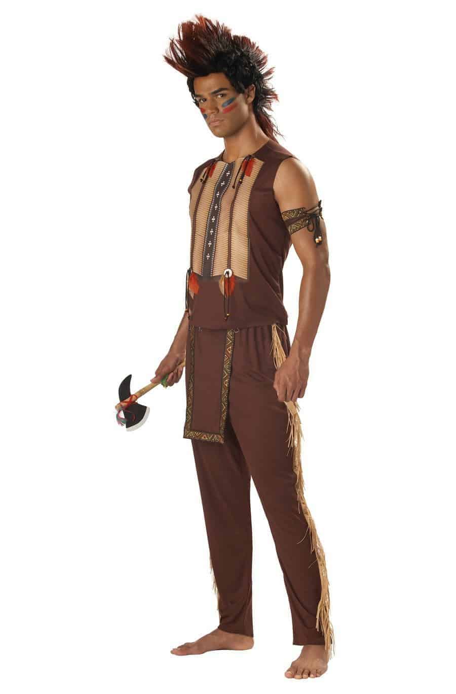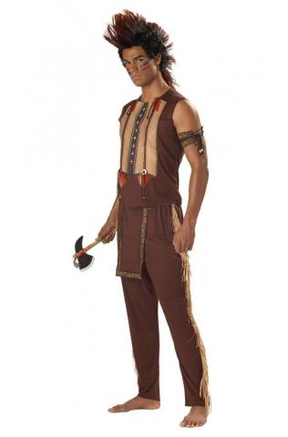 The Noble Warrior Costume includes brown shirt with Indian print on front and four attached feathered decorations. The trousers are brown with attached detailed tabard. Costume also includes 2 tied decorated armbands with beads on tie.