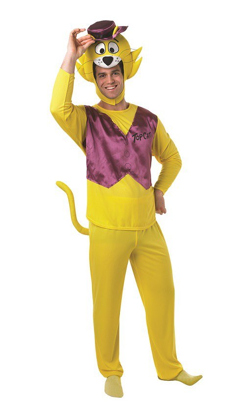 A fun costume complete with yellow top with attached purple waistcoat with "Top Cat" print, yellow trousers, and Top Cat head piece.