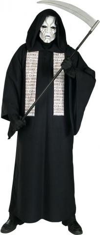 Halloween phantom mime costume consists of a black hooded robe with separate shawl.