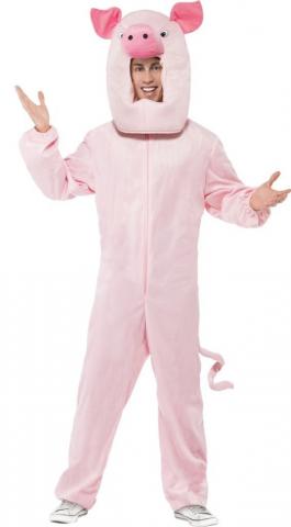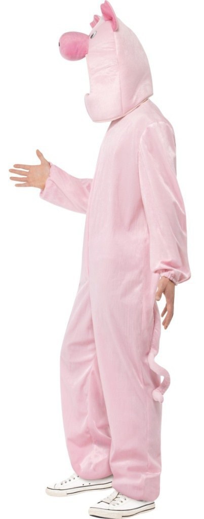 Pig costume includes a pink one piece jumpsuit with attached pig tail. The jumpsuit features a zipper front. To complete the look a pig headpiece with pig facial features is also included.