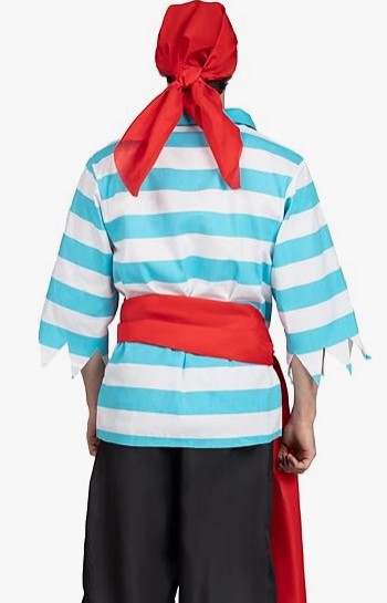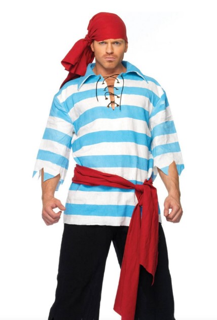 The costume features a blue and white striped shirt reminiscent of classic seafarers, pants for all-weather plundering, a waist sash to show your rank, and a head scarf to complete your rogue look. Whether you're storming a Halloween bash or leading your crew at a themed event, this outfit guarantees you'll steal the show.