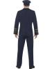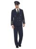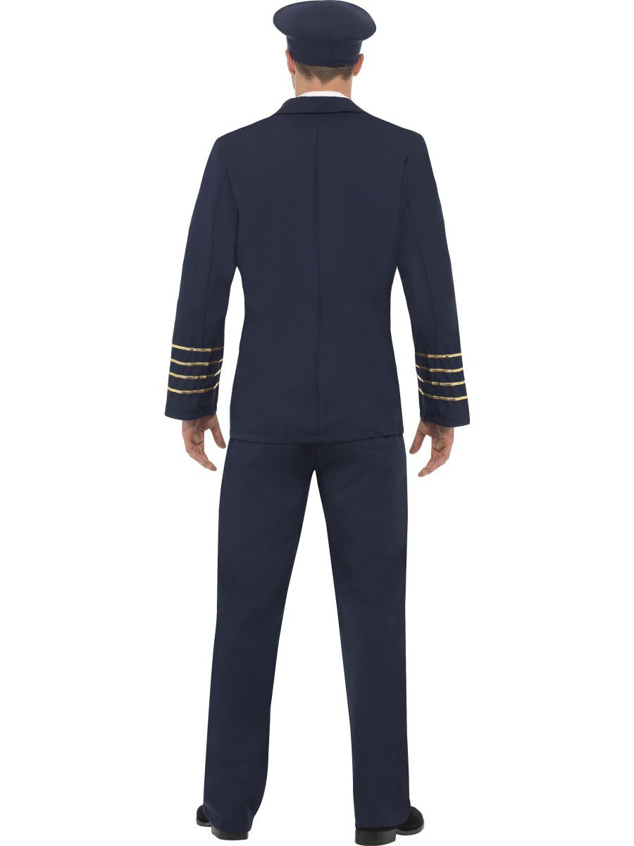 The Pilot Costume Consists of a navy jacket with gold stripes on the sleeves, navy trousers and hat.