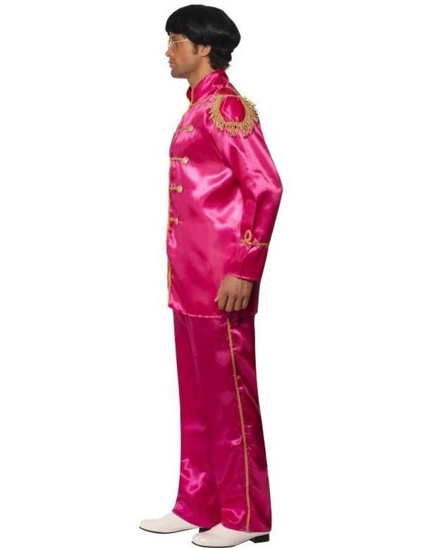 Pink Sgt Pepper Costume consists of trousers with elasticated waist and gold brocade down outside leg, jacket with gold brocade, zipped front and gold tasseled epaulets.